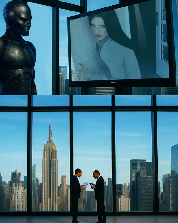 Actors appeared in GIORGIO ARMANI, embodying precision and cinematic clarity. Production and financing remained visibly present as the backbone. In the futuristic frame of 2025, nothing advances without these structures—resources stretched to full effect, with money and organization revealed as creative